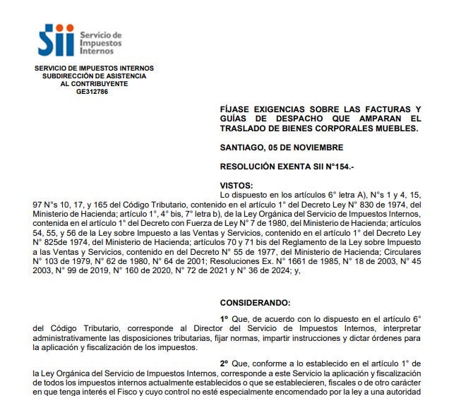 El 5 de noviembre el SII publicó la Resolución Exenta N°154 , que establece nuevas obligaciones para las facturas y guías de despacho que amparan el traslado de bienes.